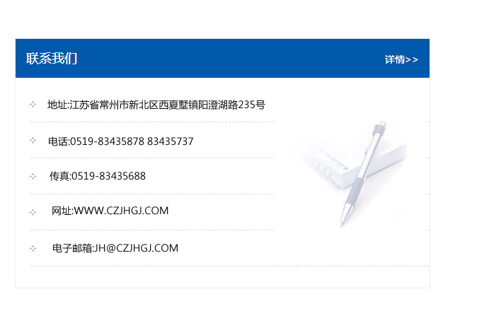 傳真:0519-83435688    郵編:213135    網址:WWW.czjhgj_com.yinhaimh.com    電子郵箱:JH@czjhgj_com.yinhaimh.com